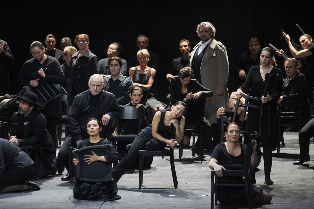 The image shows: Ezgi Kutlu (Fenena), Gergely Németi (Ismael), Marco Vratogna (Nabucco), Riccardo Zanellato (Zaccharia), Esther Dierkes (Anna), Mitglieder des Staatsopernchores Photo: Martin Sigmund