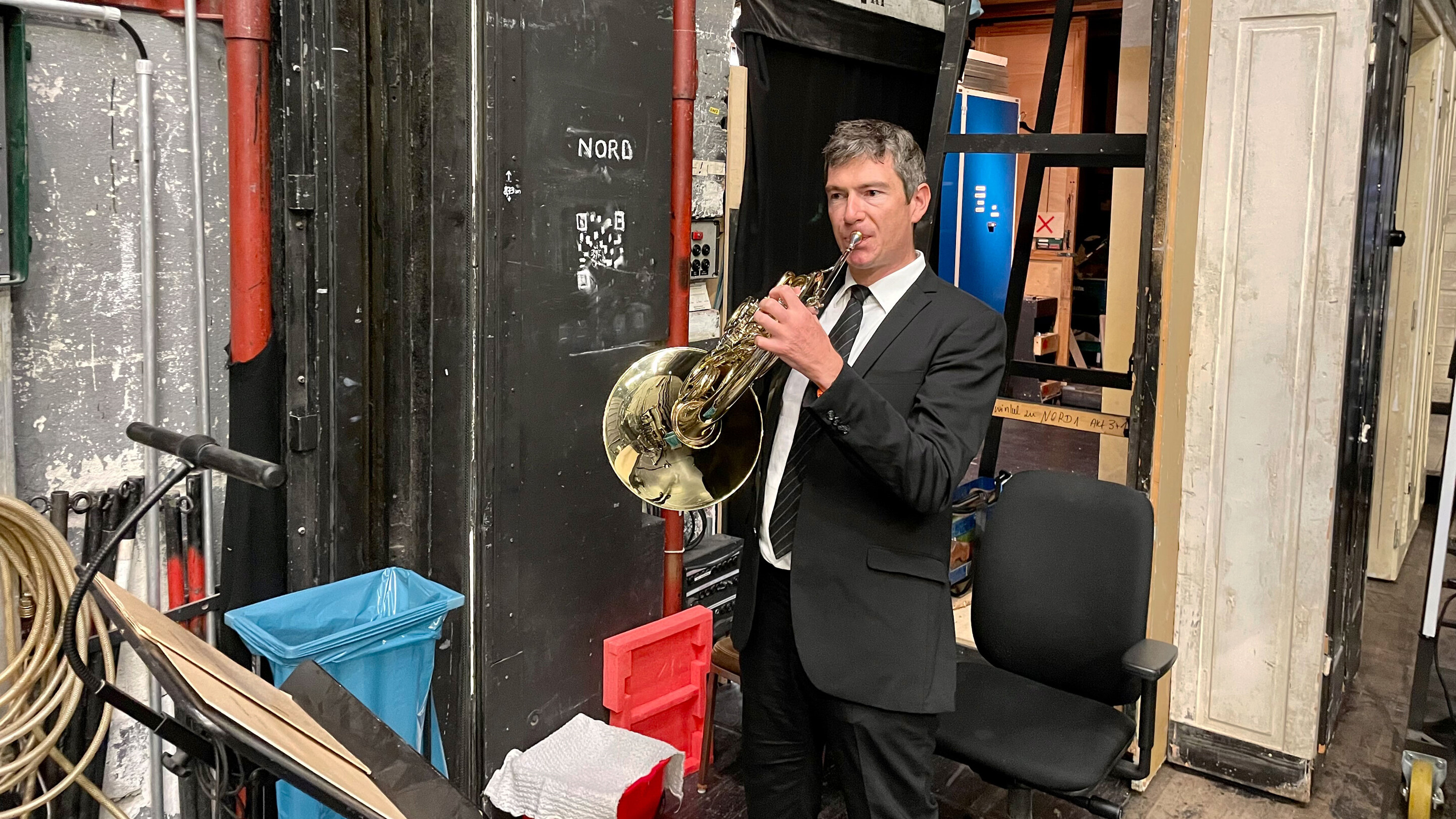 Mit dem Siegfried-Ruf hat Wagner eines der berühmt-berüchtigtsten Soli für das Horn komponiert. Es ist lang, anstrengend und endet auf dem Hohen C. Philipp Römer spielt dieses Solo. Dabei sitzt er nicht im Graben bei seinen Kolleg*innen, sondern er steht auf der Bühne hinter den Kulissen – von wo aus er den Dirigenten nicht direkt sehen kann, lediglich über den Monitor. Doch das ist nicht so wild: Die eigentliche Schwierigkeit besteht darin, sich im Spiel am Siegfried-Darsteller Daniel Brenna zu orientieren. Sobald der sein Horn-Requisit ansetzt, muss auch der Ruf erklingen.